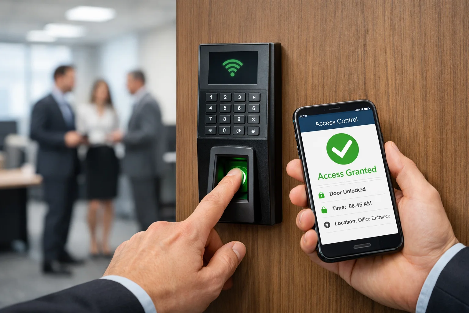 Сотрудник открывает дверь телефоном. Удобно, но требует стабильной настройки и дисциплины по телефонам. Плюсы: не надо печатать карты, можно быстро выдавать/забирать доступ. Минусы: не у всех одинаковые телефоны, есть вопросы по разрядке/потере/политике безопасности.Вариант 5. Биометрия