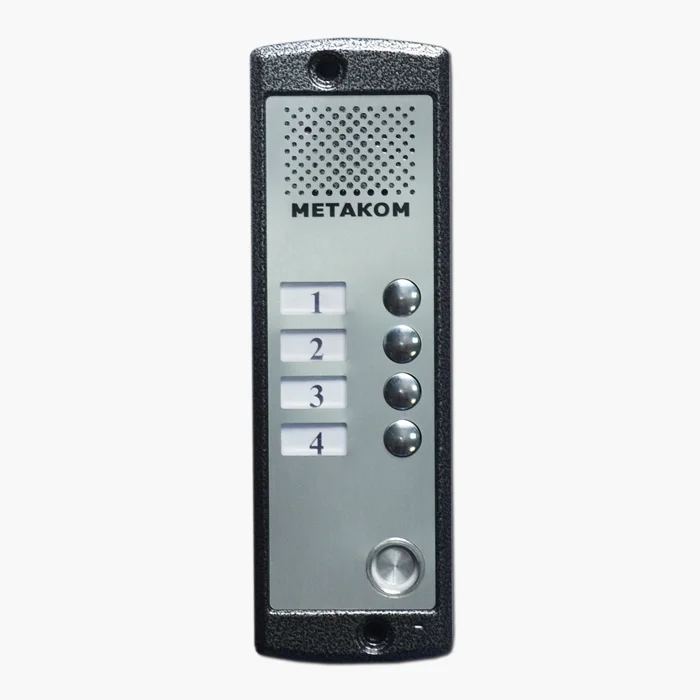 MK4-X-TM Четырёхабонентный блок вызова с системой адресации стандарта Commax. Оборудован встроенным считывателем и контроллером ключей METAKOM TM2003, Dallas DS1990A. Тип корпуса: накладной. Блок вызова домофона предназначен для установки в подъездах жилых домов, у входных дверей квартир, офисов и т.д. Обеспечивается работа совместно с абонентскими устройствами производства МЕТАКОМ (видеомониторы MKV-VM1, MKV-VM3, MKV-VM5, MKV-VM6, MKV-VM7, MKV-VM8, MKV-VM9, трубка ТКП-14Х) и другими.