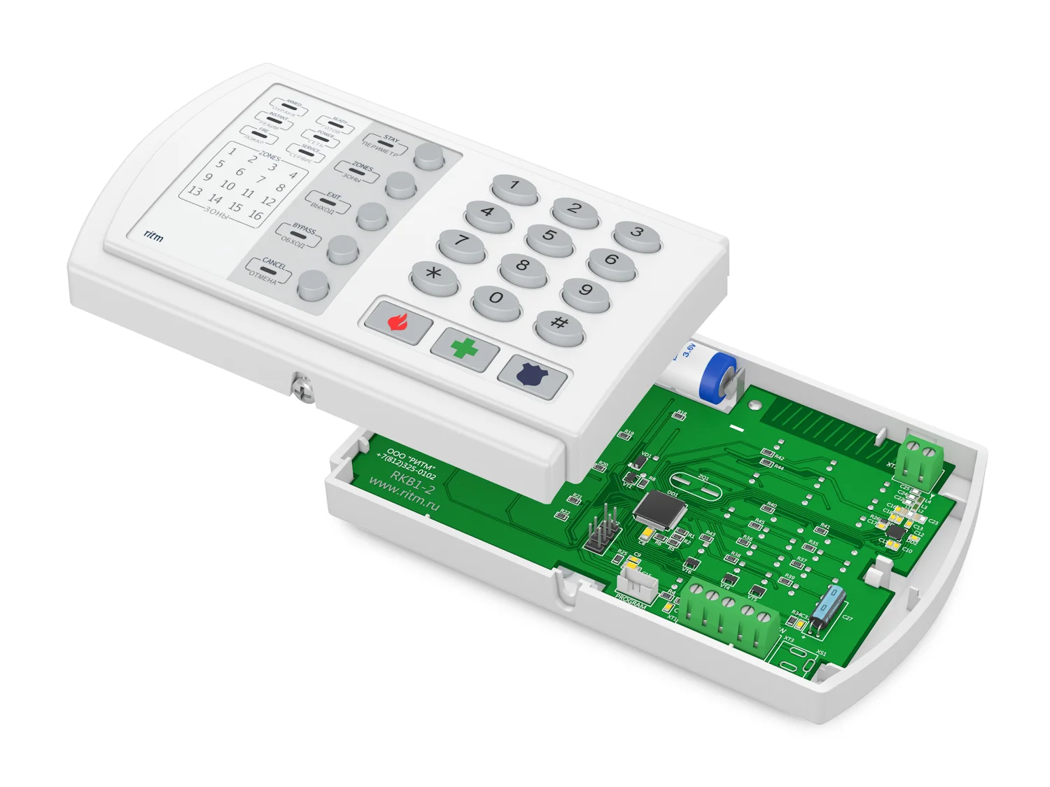 RKB1 Беспроводная радиоканальная клавиатура предназначена для работы с панелями "Контакт GSM-10", "Контакт GSM-10 A". Постановка/снятие с охраны, в т.ч. Пораздельная. Полная индикация состояния разделов. Питание внешнее 12В или от встроенного элемента питания 3,6В.Дальность работы в зоне прямой видимости — до 800 метров.