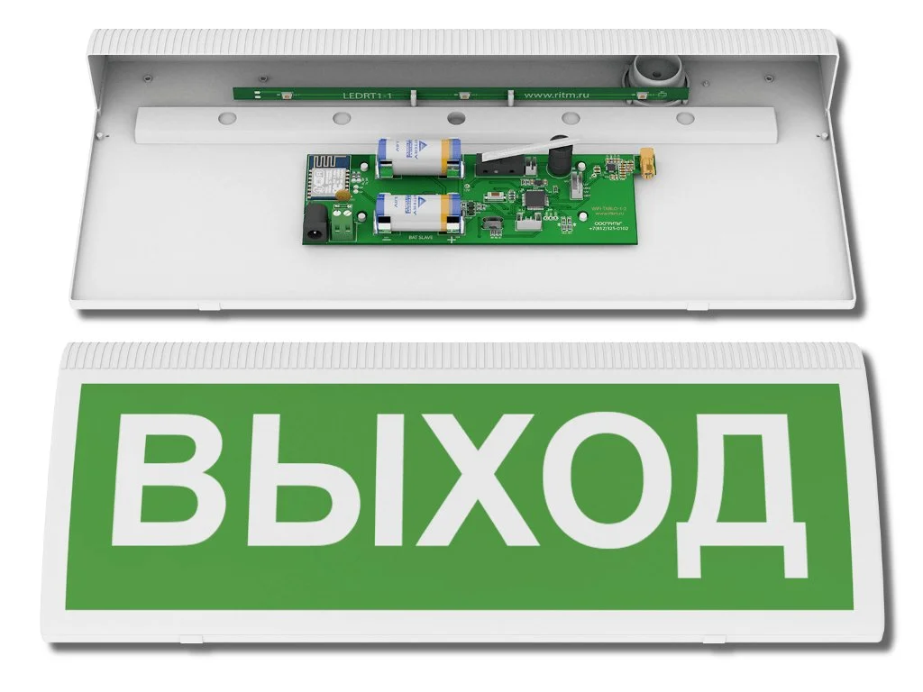Табло ВЫХОД Оповещатель световой/звуковой радиоканальный «Табло ВЫХОД», 433 МГц – радиоканальное исполнительное устройство, подключаемое к охранным приборам компании «Ритм».