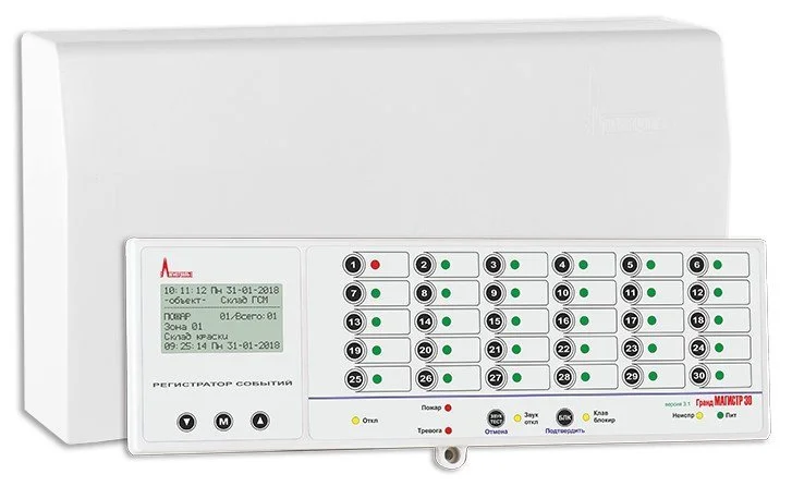 Гранд МАГИСТР 16 (версия 3.1) ППКОП 16ШС с выносной клавиатурой до 500 м, до 5 клавиатур с информативным графическим ЖК-дисплеем и встроенной подсветкой, встроенный регистратор на 1024 события, напряжение шлейфа 17...20В, ток в шлейфе сигнализации в дежурном режиме 2.1 мА, RS-485, подключение модуля Ethernet (СА+LAN), подключение релейных модулей (на 4,8 или 16 реле); U-пит. 220 В, ток потребления 0.18 А, под аккумуляторную батарею 12В/7Ач (приобретается отдельно); 4 раздела, 3 реле с перекидным контактом 24В/2А, 4 выхода типа «открытый коллектор» 12В/0.5А, выход питания внешних устройств 12В/1.2А; t-раб. ППКОП -30...+55°С, t-раб. клавиатуры +5...+55°С; габаритные размеры системного блока 345х180х90 мм, клавиатуры 295х95х32 мм
