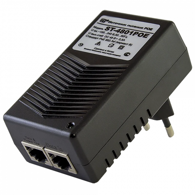 ST-4801 POE Источник питания POE однопортовый для обеспечения проводных сетей напряжением 48В., Ток нагрузки рабочий/максимальный: 0,5А, Входное напряжение: 100-240 Вольт перем.тока, Выходное напряжение, номинальное: 48Вольт 24 Ватт всего 1-н канал (порт), Защита от КЗ,защита по току/напряжению от перегрузки - 115% -150% от номинала, Тип разъема: данные/данные+питание RJ45, Соответствие стандартам: поддерживает стандарт IEEE 802.3af(вар.B), Температура эксплуатации: -10...+40°C, Габаритные размеры ИП: 84х47х64мм.