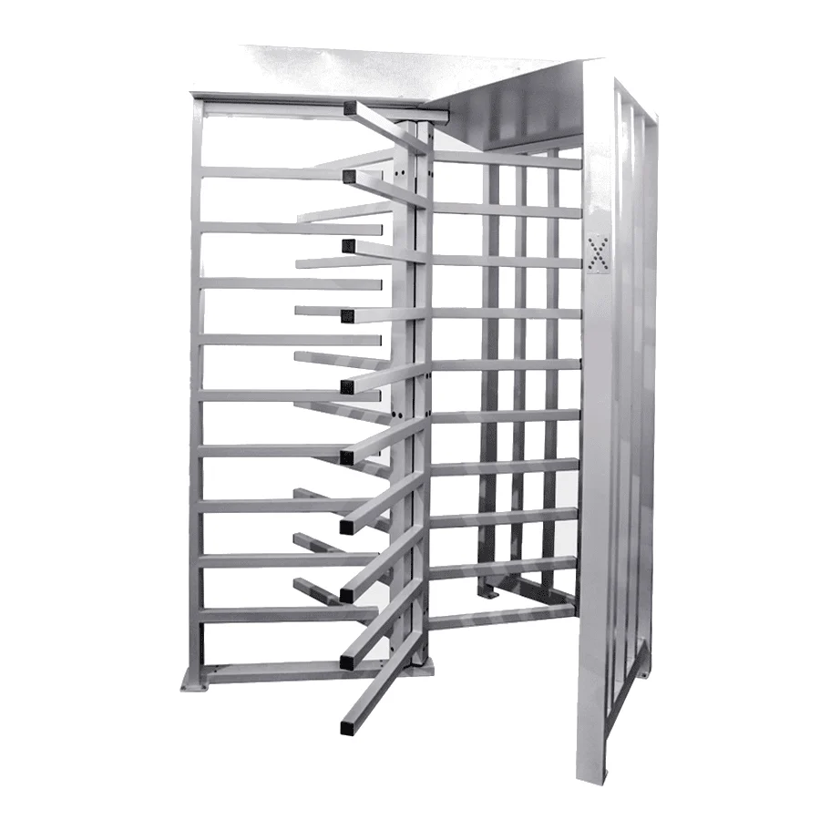 3V Model X полноростовой турникет полноростовое исполнение с преграждающими элементами и формирователями прохода с фосфатированным полимерным покрытием. Формирователи прохода (боковые стенки) турникета решётчатые, зашиты вертикальными планками (квадратная труба 40 x 40 мм, длина – 630 мм) с шагом 180 мм. Вращающаяся по вертикальной оси стойка разделена на три равных сектора с 10 горизонтальными планками.