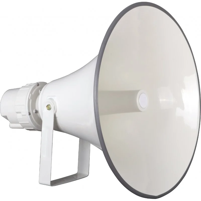 ALERTO HM-100T Для речевого оповещения обширных открытых территорий, помещений с высоким уровнем шума или производственных помещений с большой площадью подходят громкоговорители с высокой чувствительностью и самой высокой входной мощностью HM-100Т. Конструкция громкоговорителей рассчитана на уличную установку, допускающую прямое попадание атмосферных осадков. Громкоговорители HM-100T имеют круглый раструб из алюминия, окрашенного порошковой краской. Поворотный кронштейн входит в комплект поставки и обеспечивает установку громкоговорителя в вертикальной плоскости.