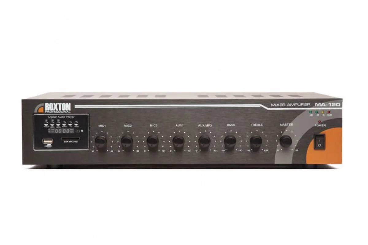 ROXTON МA-120 Мощность 120 Вт, работает в трансляционных линиях 100/70В, есть выход 4-16 Ом для под